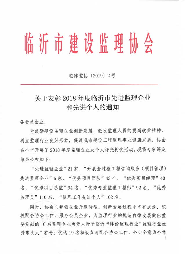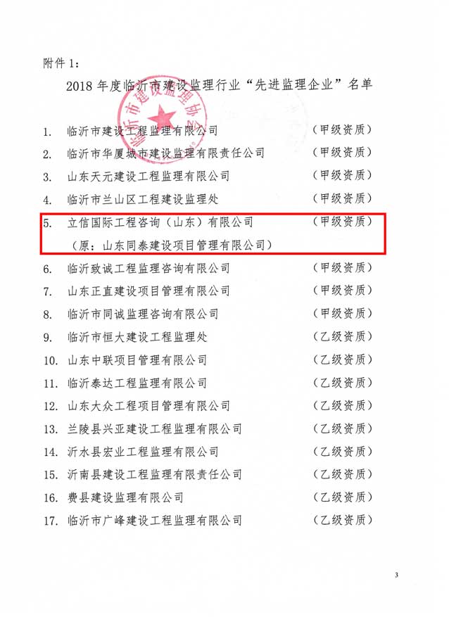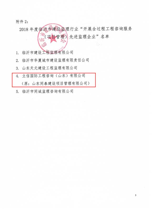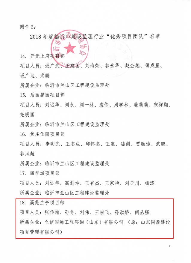 2019年5月,临沂市建设监理协会发文表彰2018年度临沂先进监理企业和先进个人。立信国际工程咨询(山东)有限公司荣获“先进监理企业”、“开展全过程工程咨询服务(项目管理)先进监理企业”荣誉称号、溪苑兰亭项目部荣获“优秀项目团队”荣誉称号。