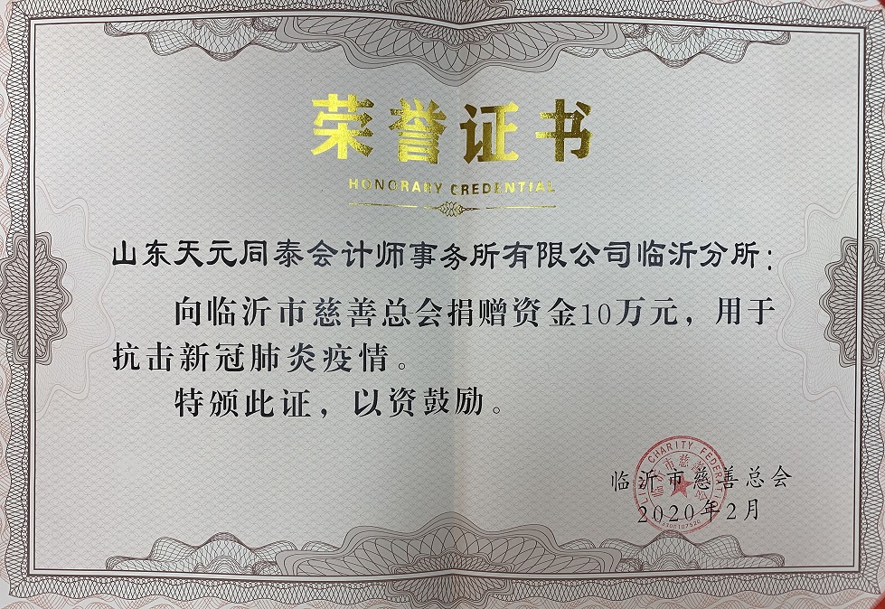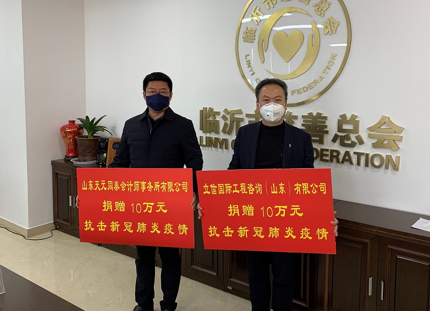 防控疫情,人人有责。在抗击新冠肺炎关键时期,全体同泰人与全国人民同呼吸、共命运,特向临沂市慈善总会捐款专项用于防控新冠肺炎,以表达同泰人疫情面前共担当的决心和信心。其中山东天元同泰会计师事务所临沂分所捐款10万元,立信国际工程咨询(山东)有限公司捐款10万元,合计20万元整。